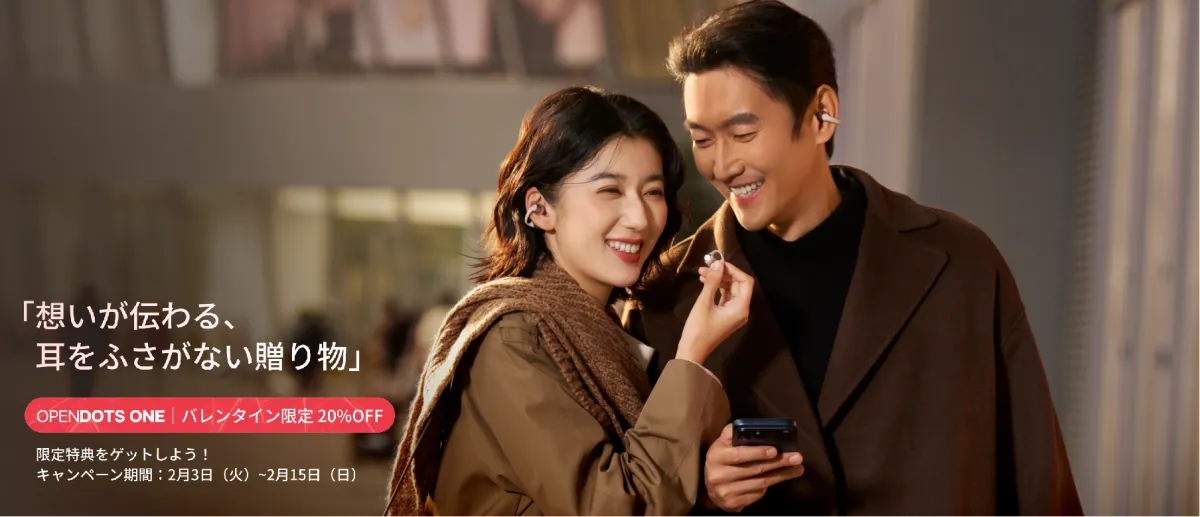 このバレンタインは、Shokzの「OpenDots ONE」と共に素敵な瞬間を大切な人と過ごしてみてはいかがでしょうか。音楽を楽しみながら、愛する人とのコミュニケーションも大切にする。新しいオーディオ体験が、あなたの日常をちょっと特別に変えてくれます。そして、その体験を通して、あなたの気持ちが更に伝わることでしょう。ぜひこの機会をお見逃しなく!