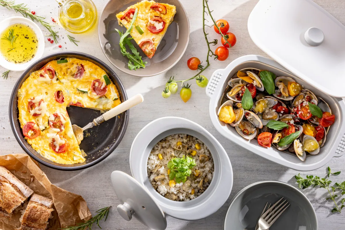電子レンジのマイクロ波を利用して内面が熱くなる特殊なプレートです。深型と浅型の2枚セットで、焼き・蒸し・温めまで一台でこなします。これ一つで忙しい時間を短縮できます。