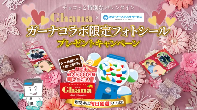 シャープの提供する「ネットワークプリントサービス」では、2月4日から3月3日までの期間限定で「ガーナコラボ限定フォトシールプレゼントキャンペーン」を実施します。全国のコンビニに設置されたマルチコピー機を使って、フォトシール(L版)が無料で印刷できるチャンスです。