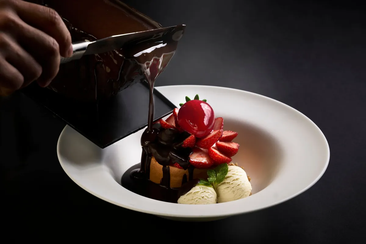 1階にある「MIXup」では、豪華な「ショコラ・ラクレット・ストロベリーケーキ」が登場。しっとりとしたロールケーキに甘酸っぱい苺をたっぷりと重ね、その上からお客様の前で溶かしたフランス産のチョコレートをかけて楽しむという、五感を刺激する体験が待っています。このケーキは、まるでアートのように美しく、特別なひとときを演出します。