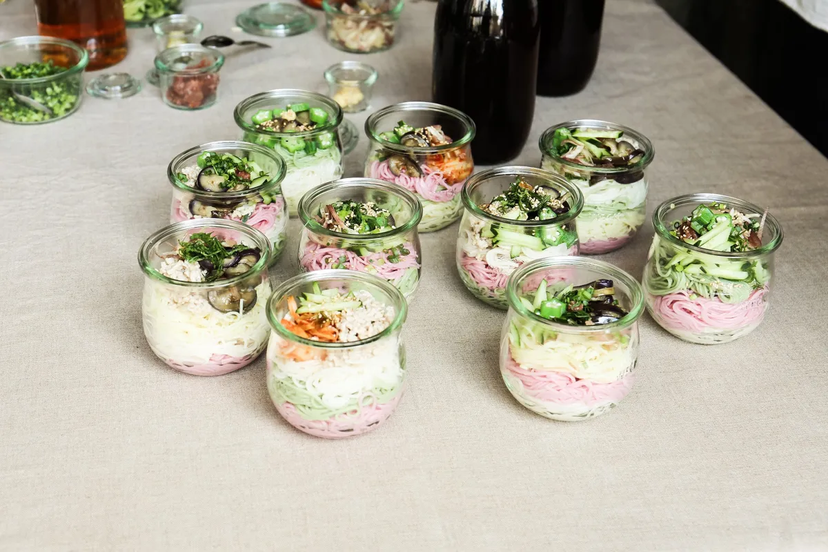 夏の定番、そうめん。人が集まった時にぴったりの料理ですが、どのようにWECKを使えるのでしょうか?WECKでそうめんをいただくスタイルはいくつかあります。まずは、薬味を入れる器として使用したり、めんつゆの仕込みにも重宝します。さらに、残ったそうめんの保存にもWECKが頼れる存在です。
