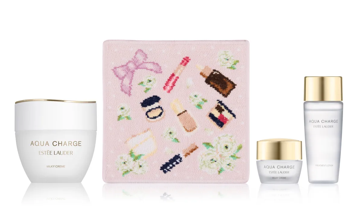 - - 内容: 医薬部外品のスキンケア「アクア チャージ」薬用ミルキークリーム50mL、同クリームのスペシャルサイズ(7mL)、トリートメント ローション、そしてエスティ ローダー×フェイラーのオリジナルハンカチ(パープル)。