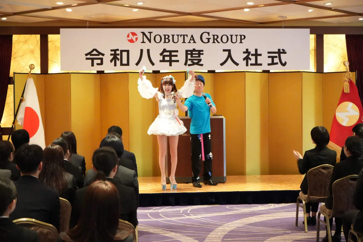 入社式の初めは、厳かな雰囲気に包まれていましたが、代表取締役社長の挨拶が終わると、突然会場に軽快なBGMが流れます。そこに突如、漫才コンビ「かつみ❤︎さゆり」が笑顔で現れ、驚きと共に新入社員たちの間に笑いが広がりました。かつみさんは「失敗を恐れず挑戦し続けることの大切さ」をユーモアを交えて語り、さゆりさんは「どんな時も笑顔でいることの強さ」を力強く伝えました。彼らの温かい言葉は、多くの新入社員に大きな勇気を与えるものとなりました。