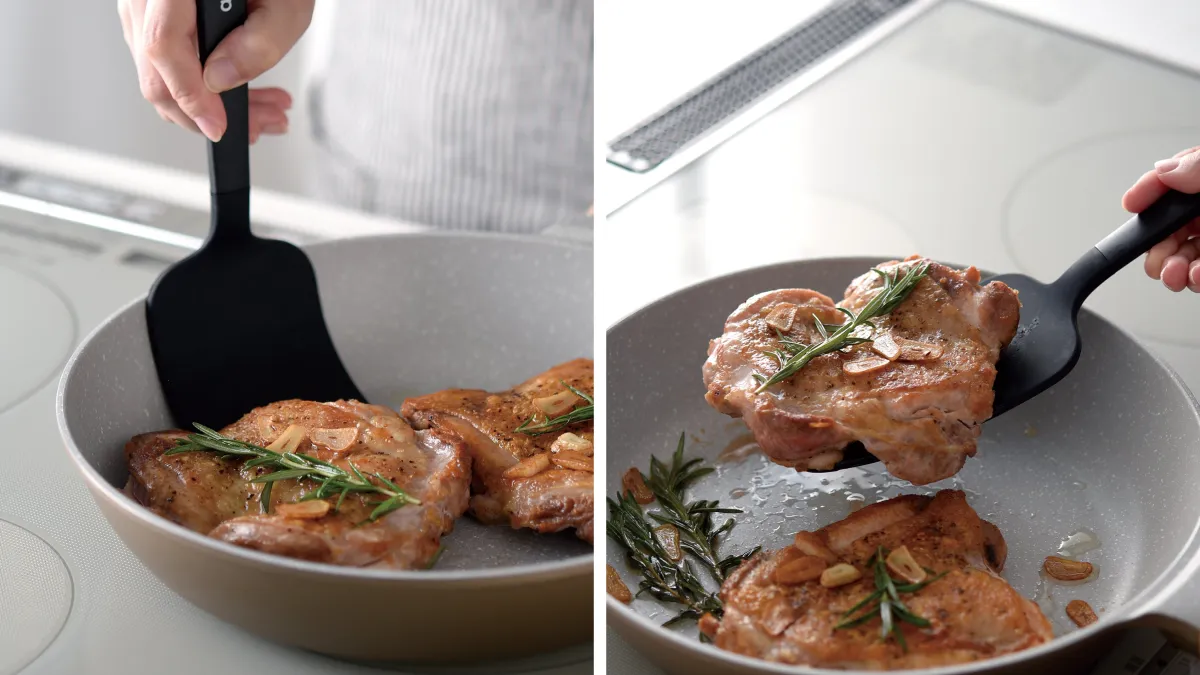 特にこだわったのは薄型の先端形状です。このデザインのおかげで食材の下にスッと差し込みやすく、特に強度と耐熱性に優れたグラスファイバー入りナイロン製のため、こびりついた食材にも対応可能です。強い力をかけられるため、日常の調理でも非常に頼りになります。