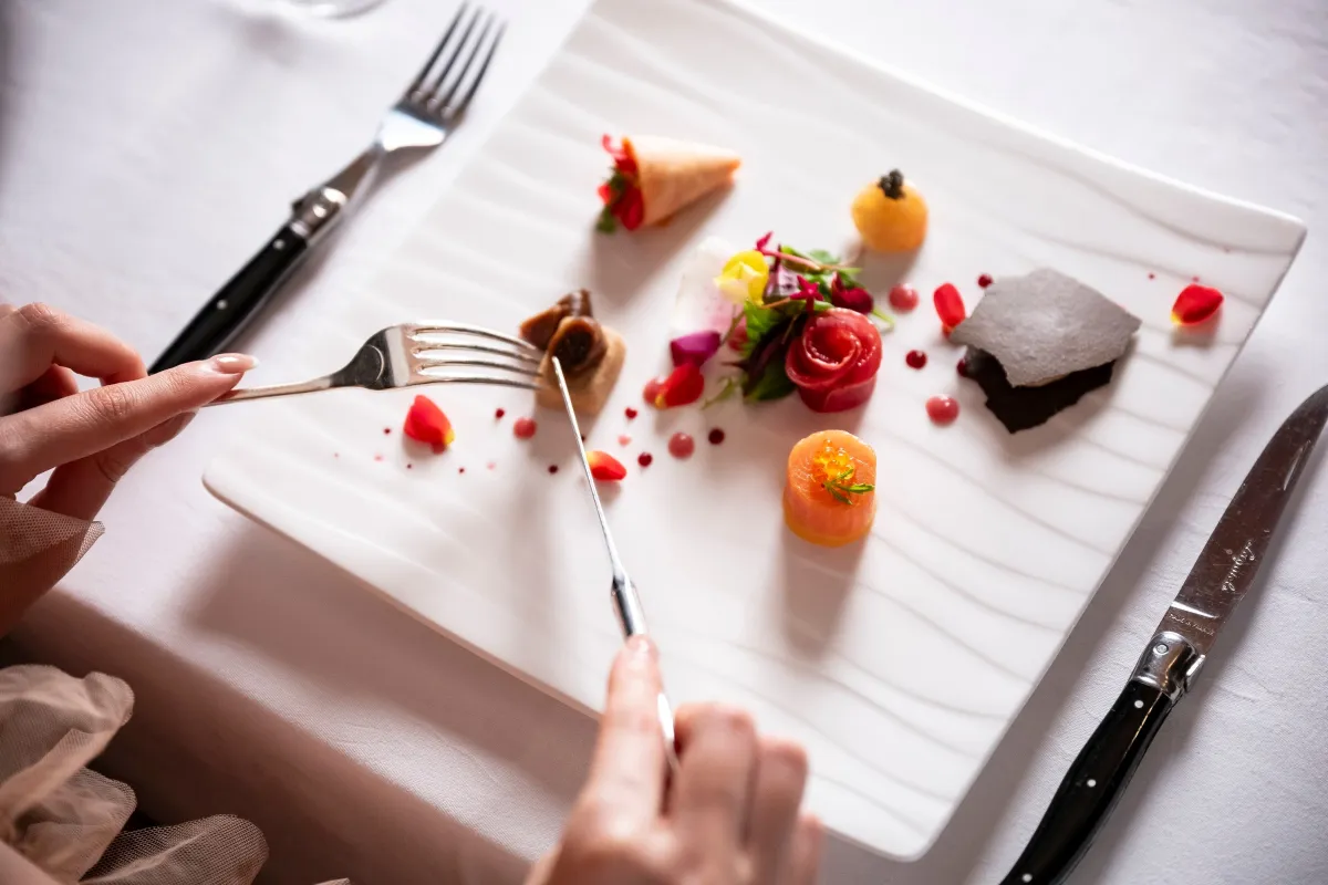 この特別コースの目玉は、まず五種のオードブル。まるで薔薇の花畑を思わせる美しい盛り付けで、視覚的にも楽しませてくれます。オードブルには、カダイフを纏った鮮魚のフリットや、アドベリーの酸味を効かせた牛フィレ肉の瞬間燻製がラインナップ。これらの料理は、国際料理賞コンクールで受賞歴のあるシェフ坂田が手がけたものです。彼の繊細な感性と高い技術が、一品一品に感謝と愛情の物語を宿します。