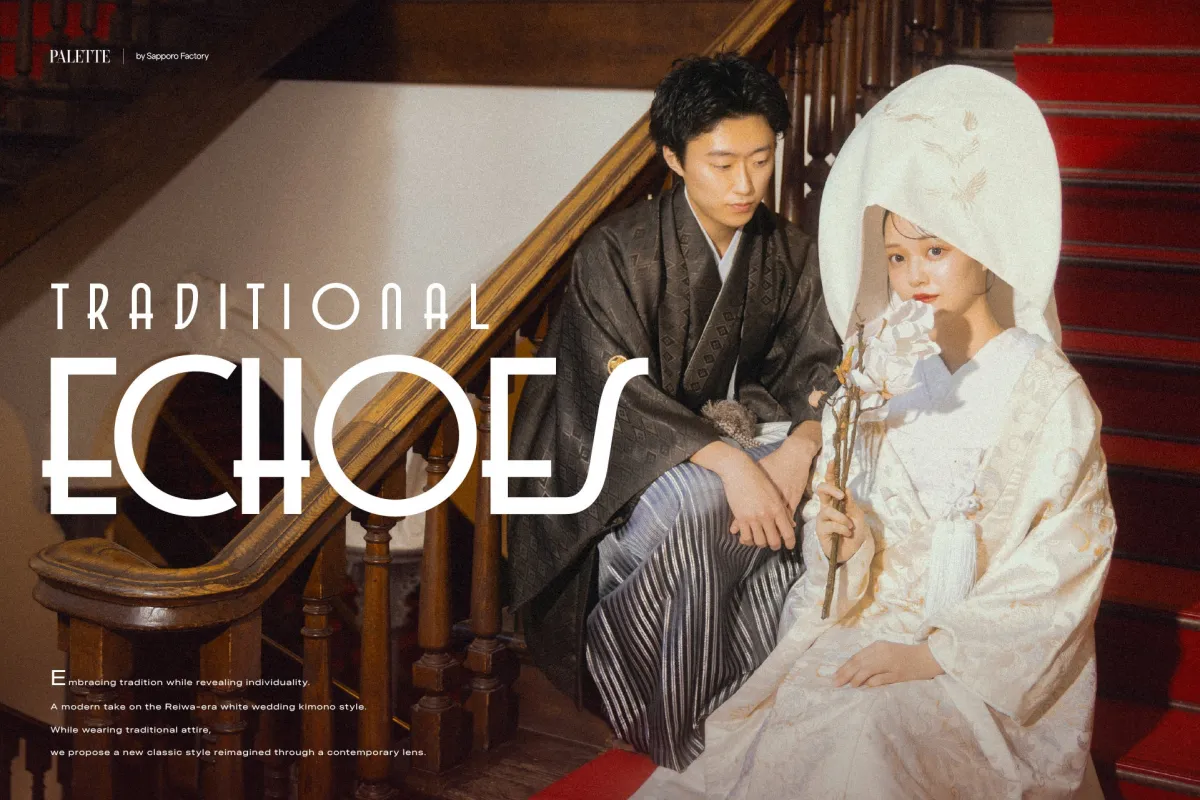 白無垢は日本の婚礼における重要な象徴であり、その持つ格式や意味を尊重しながらも、時代に応じて表現が進化しています。「TRADITIONAL ECHOES」では、歴史的な建物である北海道庁をロケーションに選び、クラシカルな空間に流れる光と影が印象的なシーンを生み出しています。時間の流れを感じさせるその演出は、伝統が現代に“反響(ECHOES)”する瞬間を見事に捉えています。