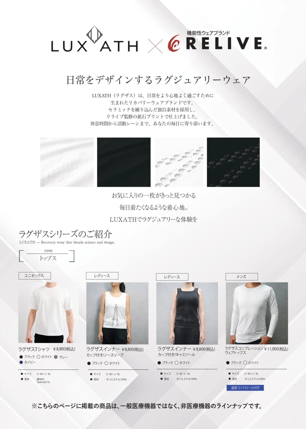 「LUXATH(ラグザス)」は、株式会社ユアーショップが製造販売を手掛ける新しいシリーズです。更に、株式会社りらいぶが提供する独自の「リライブ加工」技術を用い、快適性や着用感の向上を図っています。このコラボレーションにより、機能性と安全性が高次元で両立された製品が実現しました。
