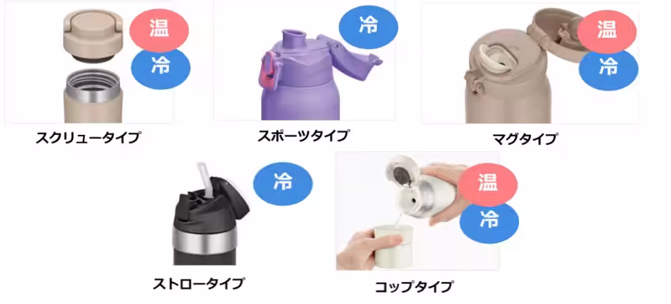 サーモスの水筒は、大きく分けて五つの飲み口のタイプがあります。温・冷両用の飲み口から、スポーツタイプやストロータイプの冷専用飲み口まで、それぞれ用途が異なるため、好みに応じて選ぶことが大切です。特に新しく登場した「真空断熱ケータイマグ(JOYシリーズ)」は、飲み口の形状が改善されており、スムーズに飲み物が流れてくるのが特徴です。