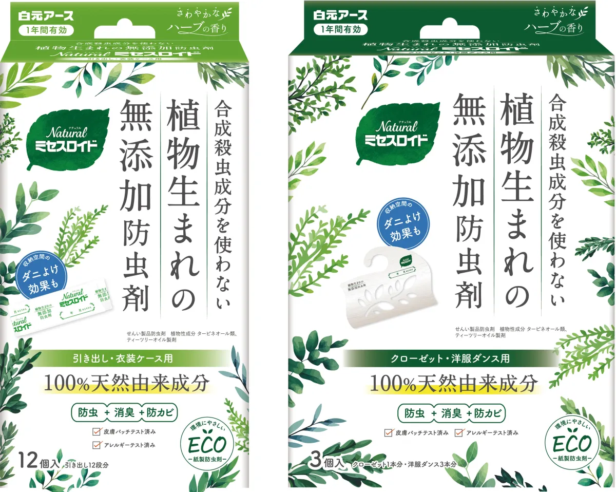 白元アース株式会社から、合成殺虫成分を一切使わない、100%天然由来の防虫剤『Naturalミセスロイド 引き出し用』『クローゼット・洋服ダンス用』が、2025年8月1日にリニューアルし新発売されます。2018年の初発売以来、多くの方々に愛用され、特にベビー服や子供服にも安心して使えるとして高く評価されてきました。