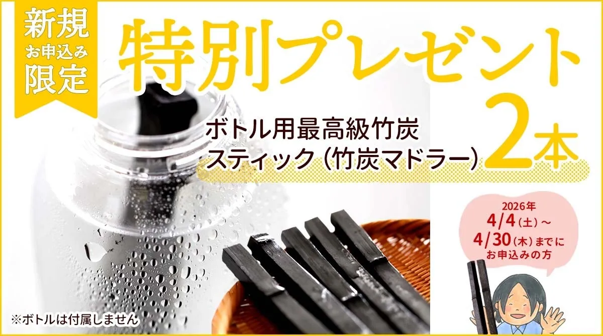 特典として提供される「最高級竹炭スティック」は、国産孟宗竹を高温でじっくり焼き上げた逸品です。シンプルなデザインで使い勝手も良く、コップやボトルに入れるだけで手軽にご使用いただけます。多孔質な炭の特性により、飲み物の口当たりを優しく整え、自然素材のもつ香りや風合いを楽しむことができます。