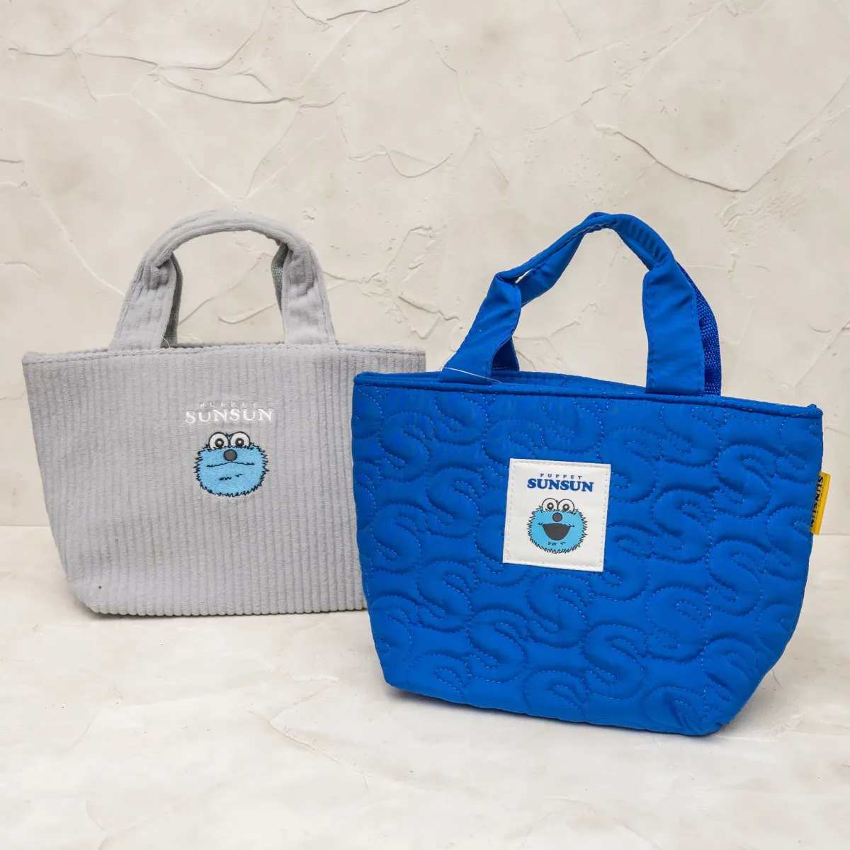 日常のランチタイムが楽しくなる、スンスンをモチーフにしたランチバッグは、2種類の素材から選べます。ポップな印象の「キルティング生地ランチバッグ」は、青色の生地に「S」の字のステッチが施され中央にはスンスンのワッペンが特徴です。一方の「コーデュロイ生地ランチバッグ」は、落ち着いたグレーにスンスンの顔が刺繍され、シンプルでありながらキャラクターの魅力を存分に引き出しています。どちらもマチが広く、お弁当箱や水筒がすっきり収納可能。