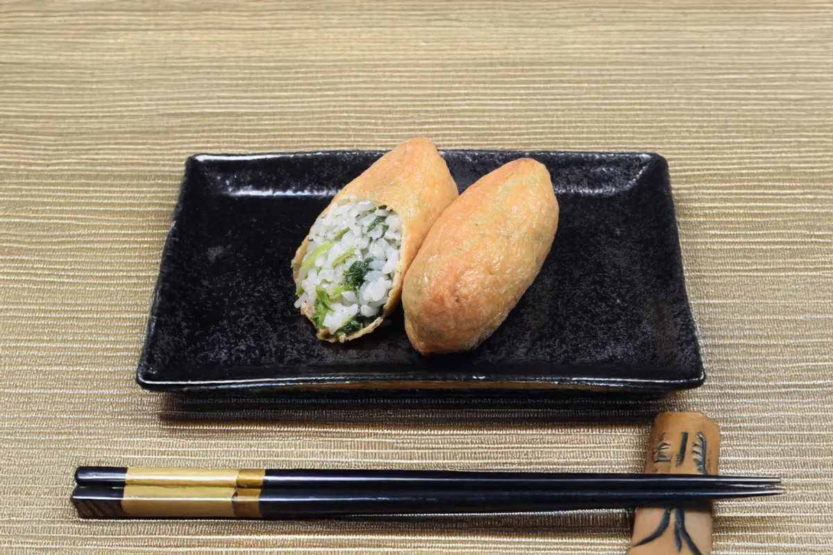 春の七草と野沢菜を使ったシャリを、甘めのいなり揚げに詰め込んだ一品。美味しさだけでなく、見た目も楽しめるバランスの良い組み合わせです。