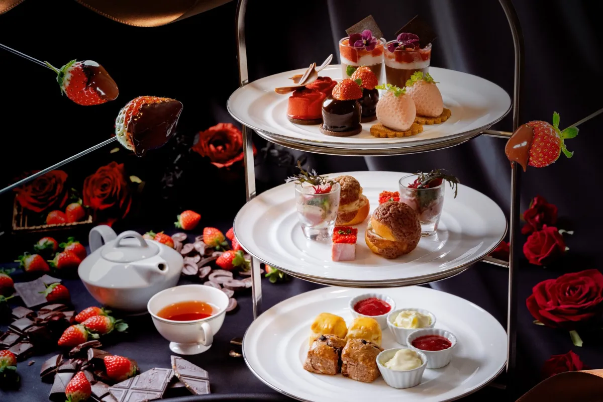 このアフタヌーンティーには、いちごとチョコレートを使用した多彩なスイーツが揃います。シェフがその美しい造形にこだわったスイーツたちは、まるでアートのように華やか。例えば、真っ赤なムースで作られた「ルビーチョコレートローズ」や、いちごを模した見た目が可愛らしい「フレーズ」など、どれも食べるのがもったいないほどです。