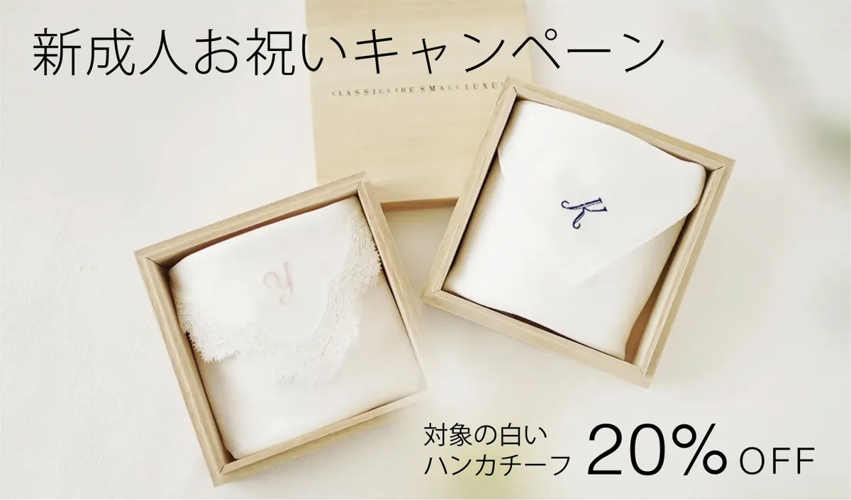 新たな人生の一歩を踏み出す新成人の皆さまに向けて、ハンカチーフ専門店「クラシクス・ザ・スモールラグジュアリ」が素敵なプレゼントを用意しました。2025年12月12日から2026年1月12日まで、六本木ヒルズ本店と日本橋人形町店で開催される「新成人お祝いキャンペーン」では、対象の白いハンカチが20%OFFでご購入いただけます。