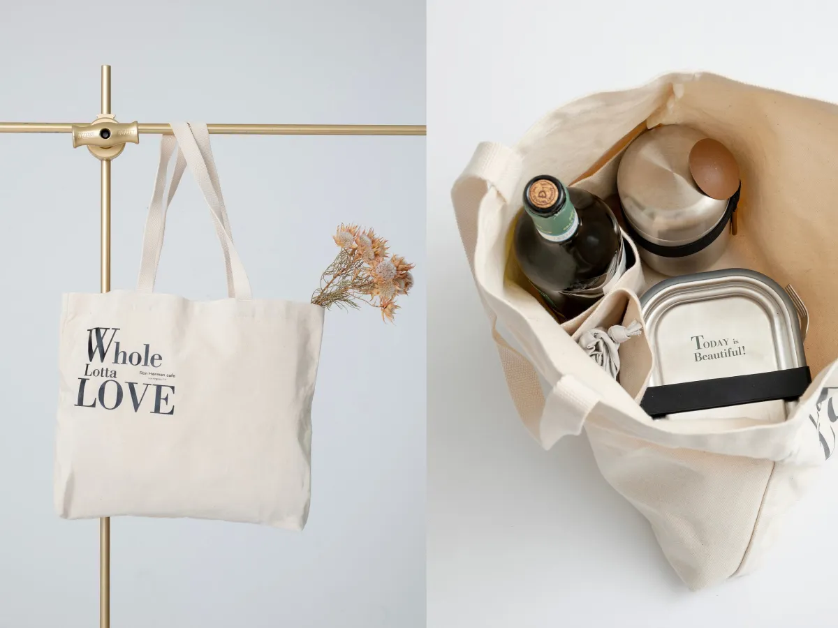 今回は、「WHOLE LOTTA LOVE」シリーズの第3弾として、実用性に優れたアイテムがラインアップ。まずは、オーガニックコットンキャンバストートバッグです。このバッグは、丈夫なキャンバス生地を使用し、内部には小物収納用のポケットとワインボトルを立てたまま収納できるスペースがあります。買い物やホームパーティー、キャンプなど、様々なシーンで活⽤できることでしょう。