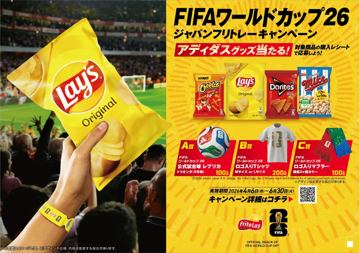 ジャパンフリトレー株式会社(カルビーグループ)は、4月6日から新たな「FIFAワールドカップ2026ジャパンフリトレーキャンペーン」をスタートします。対象スナック商品を300円以上購入し、レシートをキャンペーンサイトにアップロードすると、抽選で400名にアディダスのオリジナル商品が当たります。商品ラインアップには、公式試合球のレプリカ、エンブレム付きのTシャツ、カラーのマフラーが含まれています。
