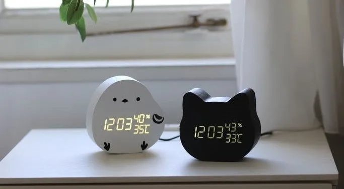 これらの時計は、アラーム機能、カレンダー表示、温度表示など、多機能を搭載。生活の中での小さな必要をしっかりサポートしてくれます。また、省エネモードも搭載しており、音や振動に反応して数字が表示されるため、夜寝るときは光を気にせず使用可能。使わないときは愛らしいデザインの置物として、インテリアに華を添えます。