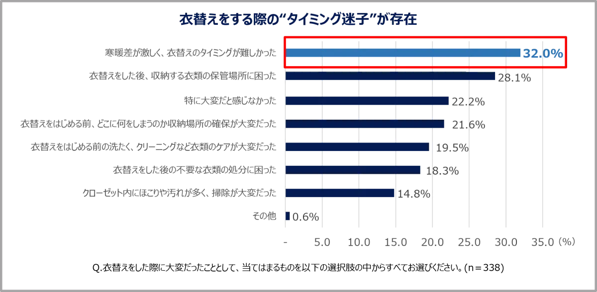 調査によると、昨年の冬から春・夏への衣替えを実施した人は全体の56.2%に達しました。しかし、最も多くの人が大変だと感じたのは、「寒暖差が激しく、衣替えのタイミングが難しい」という点でした。この異常気象が、私たちの日常生活に影響を及ぼしていることが伺えます。