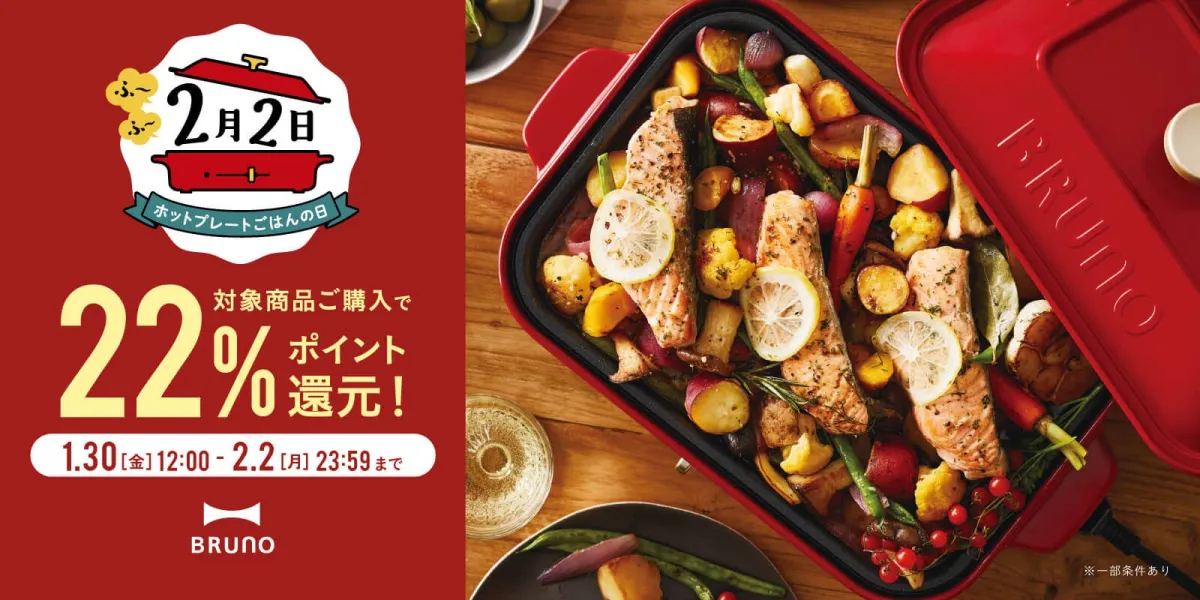2月2日は、「ホットプレートごはんの日」。この日は、BRUNO(ブルーノ)がホットプレートを通じて、家族や友人との楽しい団らんのひとときを広めることを目的として制定された特別な日です。これを記念して、直営店舗及びオンラインで「BRUNOポイント22%還元キャンペーン」が開催されます!