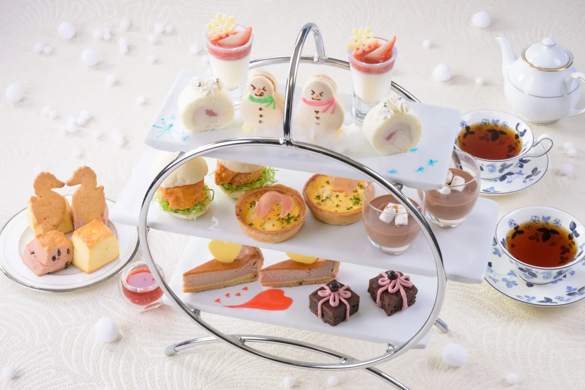 アフタヌーンティーの上段には、可愛らしい雪だるまを模したマカロンや雪をイメージしたスノーパンナコッタ、そして雪に包まれたロールケーキが並び、視覚的にも楽しめる美しい盛り付けが特徴です。また、伊勢海老ビスクスープを使ったクリームコロッケのミニバーガーや、あおさ豚の生ハムチップが添えられたキッシュなど、心温まるセイボリーも揃っています。