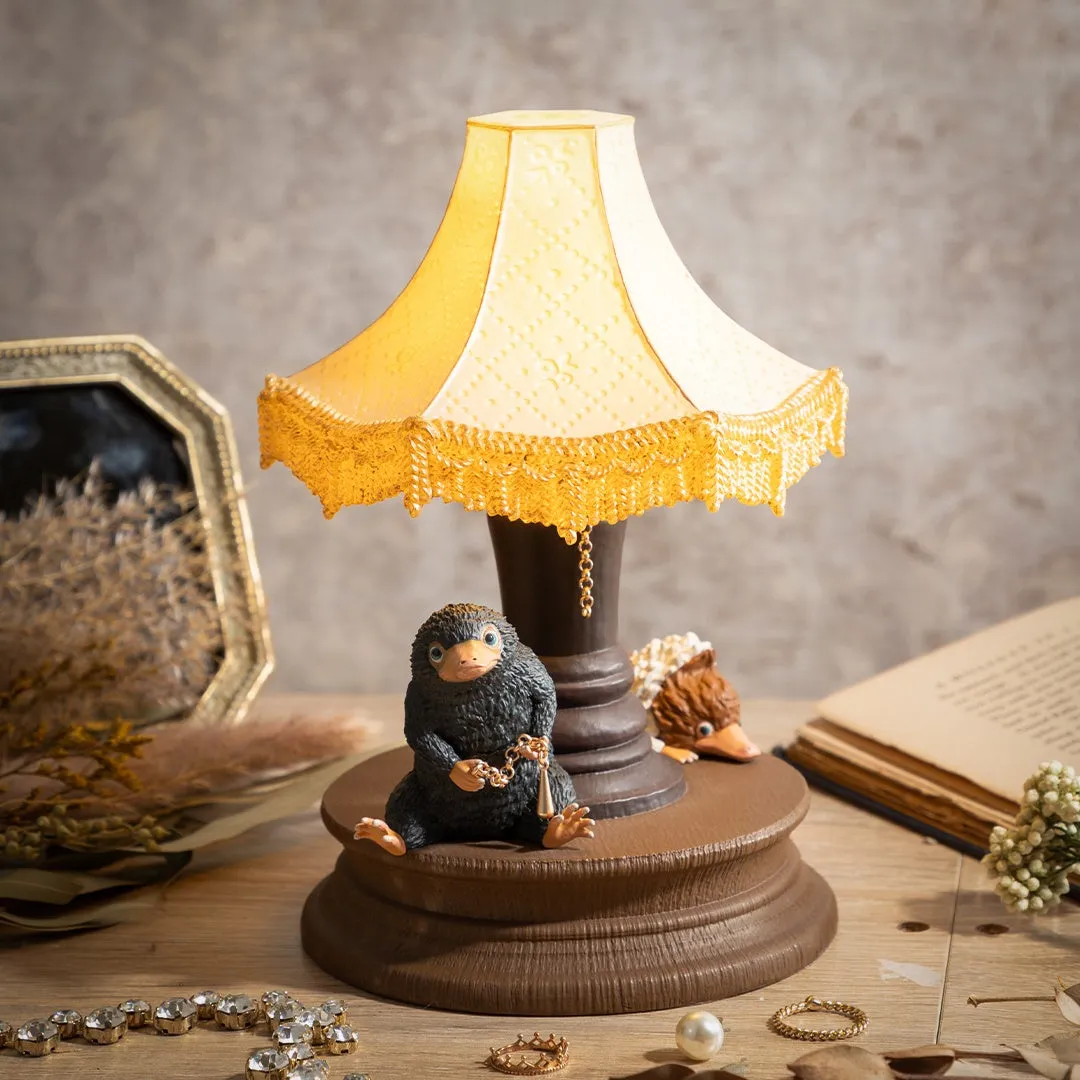 新商品となる「ファンタスティック・ビースト ベビーニフラー ランプ」は、2匹の可愛らしいニフラーたちが、ランプの台座で楽しそうに遊んでいる様子を表現しています。特に注目したいのは、悪戯好きな真っ黒なベビーニフラーが、ちぎれたチェーンを持っているデザインです。これは、映画中の彼らが宝物を見つける様子を彷彿とさせる素敵なディテール。