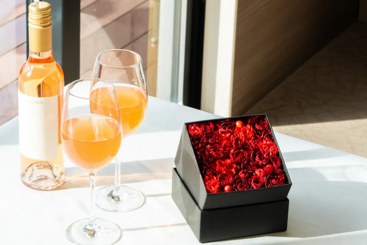 次に、フレッシュフラワーボックスのプレゼント。チェックアウト後にもこの特別な時間の余韻を感じられるように、ホワイト・グリーン・ピンク・レッドといった美しいデザインから選べるフラワーボックスを用意。オプションとしてプリザーブドフラワーも選べるので、自宅でも美しい花々を愉しむことができます。