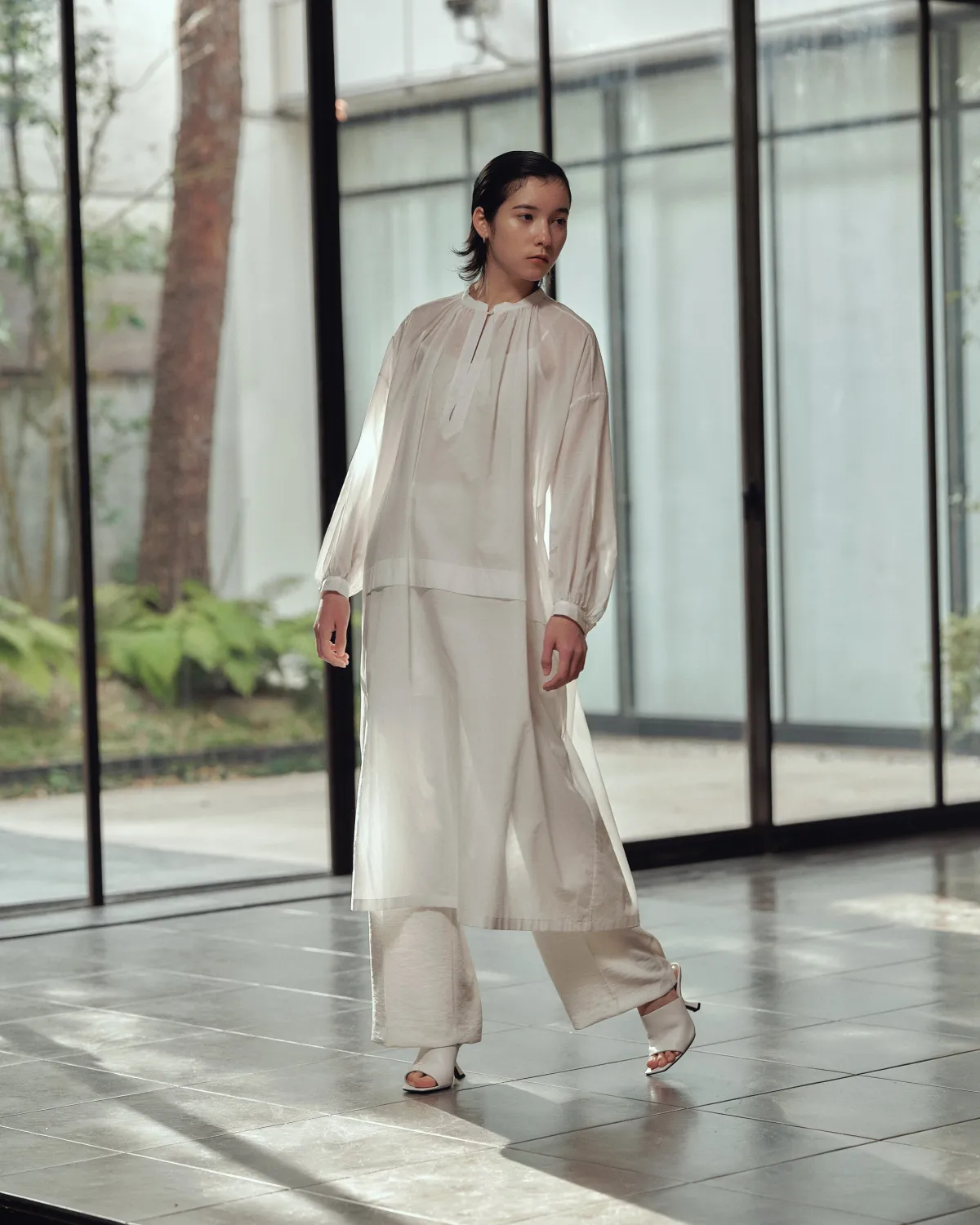 透け感のある綿素材を用いたワンピース。たっぷりギャザーが施され、生地本来の柔らかさが魅力です。縫い目がなく生地の質感が際立つデザインです。